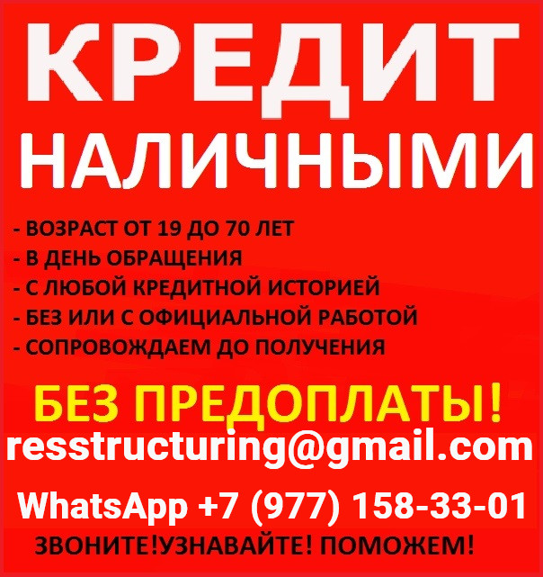 У вас просрочки и банки вам отказывают? Обращайтесь, мы поможем найти выход из ситуации. Помогаем клиентам с плохой кредитной историей, открытыми просрочками, черным списком, стоп листом, отсутствием официального трудоустройства, множеством отказов, судебными решениями и т. д. Рассматриваются суммы до 5 000 000 рублей. Без залога, справок и поручителей по двум документам. Возраст заемщика от 19 лет, регистрация и получение в любом регионе РФ. Предложение только для разумных и ответственных заемщиков! По всем вопросам пишите нам на эл. почту resstructuring@gmail. com, по телефону и WhatsApp +7 977 158-33-01