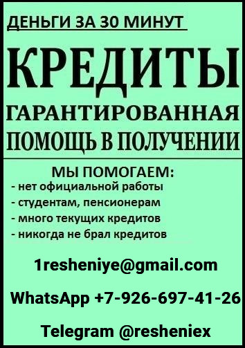 Доступный кредит на законных условиях с любой кредитной историей и открытыми просрочками. Без залога и справок. Без предоплаты за страховки, нотариусов, комиссий! Актуально для всех регионов РФ. Получение в день обращения. Наличие испорченного кредитного рейтинга, просрочек, черного списка и стоп-листов –не проблема. Заявка подается дистанционно. Вы приезжаете в банк один раз на подписание договора и получение денег. Обращайтесь к нам и получите кредит без переплат уже сегодня. Электронная почта: 1resheniye@gmail. com; WhatsApp +7-926-697-41-26; Telegram @resheniex