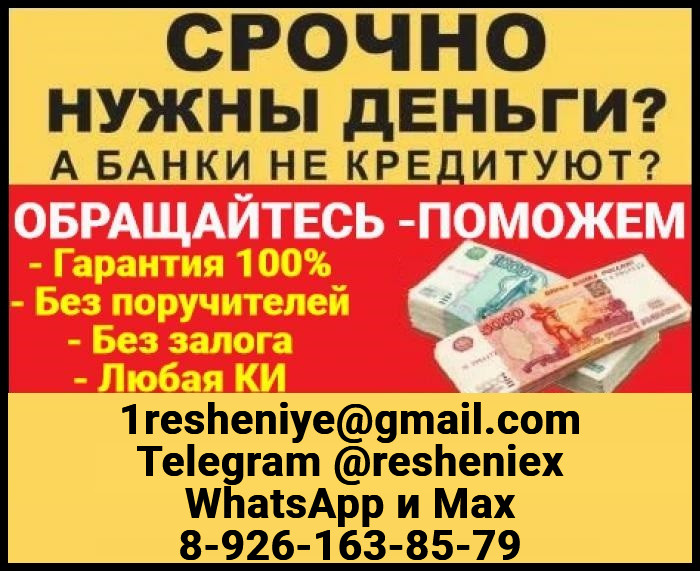 Доступный кредит на законных основаниях. Гарантируем получение кредита всем. Отрицательная кредитная история или ее отсутствие, просрочки - не повод для отказа. Оформим каждому заемщику суммы до 5 000 000 рублей на длительный срок до 8 лет. Получение в день обращения без лишних документов, нужен только паспорт и второй документ на выбор! Работаем без залогов, предоплаты и поручителей. Гарантируем защиту ваших персональных данных. Помогаем студентам, пенсионерам, безработным, работающим не официально. Просьба писать на электронную почту 1resheniye@gmail. com; Telegram @resheniex; WhatsApp или Max 8-926-163-85-79